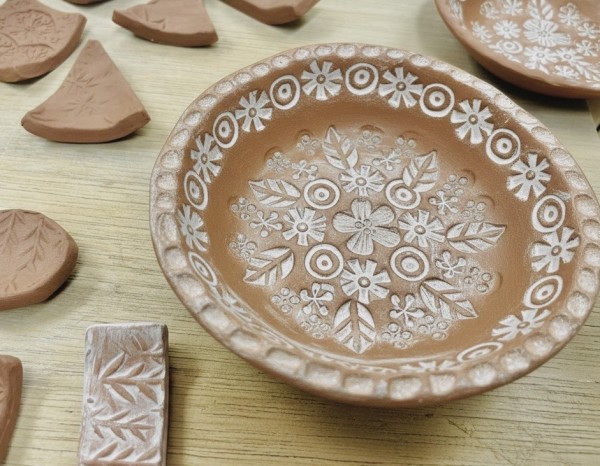 温かみのある赤土を使い白化粧と模様のコントラストを味わう手びねりの器作り。